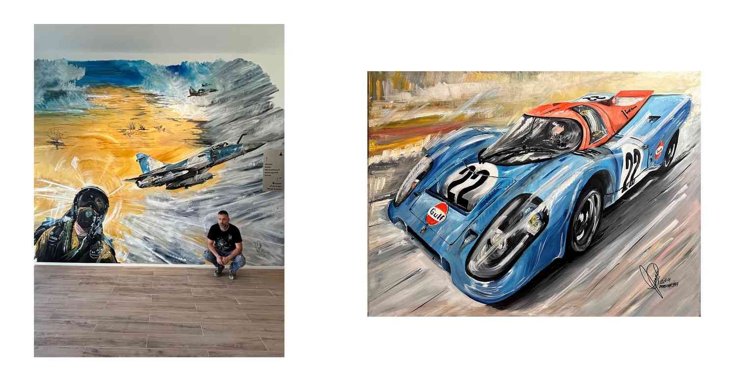 Son parcours singulier, marqué par le monde de l’aéronautique et de la mécanique, façonne une œuvre puissante où l’aviation, la moto et l’automobile deviennent des terrains d’expression artistique à part entière. Ces univers techniques, chargés de vitesse et de tension, sont sublimés par une approche sensible et instinctive de la peinture.